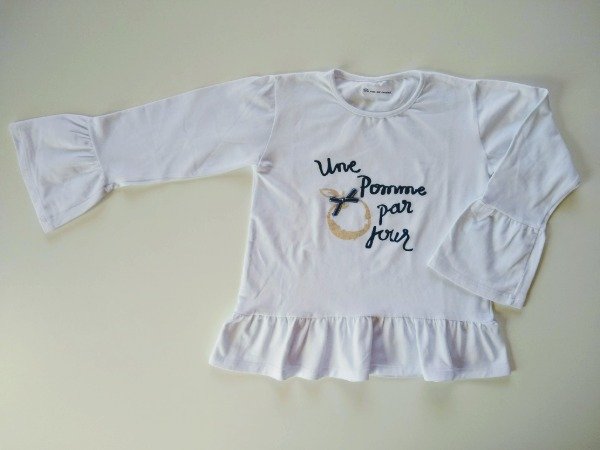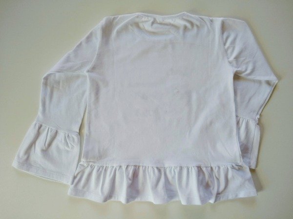 Remera manga larga de algodón color blanco con estampa con brillo y aplique. Tiene volados en las mangas y en el extremo inferior. Medidas: ancho de hombro 31 cm, largo de manga 41 cm, largo total 46 cm, COMO NUEVO