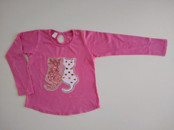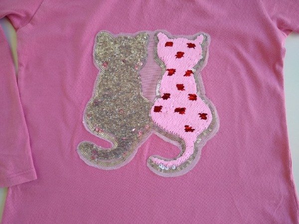 Remera manga larga de algodón color rosado con aplique en lentejuela bifaz. Es un talle 10 chico. Medidas: ancho de hombro 26 cm, largo de manga 45 cm, largo total 46 cm.. USADO.