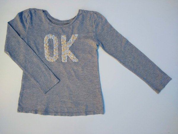 Remera manga larga color gris melange. Tiene incripción en el frente bordada con lentejuelas y mostacillas. Medidas: ancho de hombro 31,5 cm, largo de manga 51 cm, largo total 47 cm. USADO
