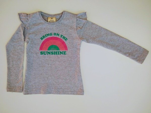 Remera manga larga de algodón color gris melange con estampa con brillo. Tiene voladitos en los hombros. Medidas: ancho de hombro 27 cm, largo de manga 45 cm, largo total 46 cm. COMO NUEVO