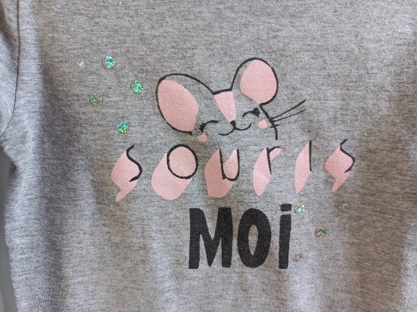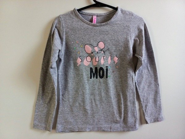 Remera manga larga de algodón en color gris melange con estampa con brillo. Medidas: ancho de hombro 23 cm, largo de manga 40 cm, largo total 43 cm. COMO NUEVO