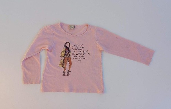 Remera manga larga de algodón en color rosado. Medidas: ancho de hombro 28 cm, largo de manga 39 cm, largo total 42 cm. USADO