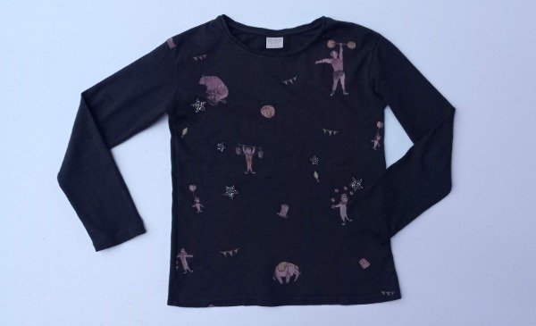 Remera manga larga de algodón en color gris plomo con estampa con brillo y perlitas al frente. Talle 9-10 años. Medidas: ancho de hombro 40 cm, largo de manga 50 cm, largo total 55 cm. USADO, buen estado