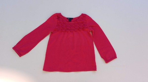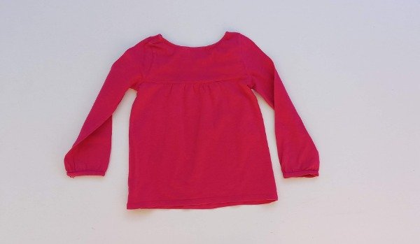 Remera manga larga de algodón color rosa con aplique en la pechera. Talle 4-5 años. Medidas: ancho de hombro 24 cm, largo de manga 39 cm, largo total 43,5 cm. USADO, buen estado