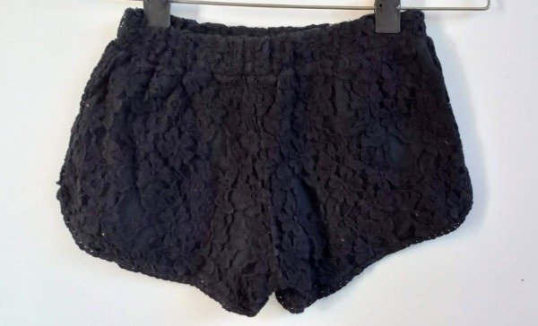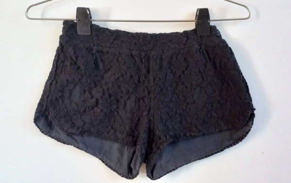 Short de encaje en color negro, integramente forrado. Medidas: cintura 28 cm, largo 22 cm. USADO, excelente estado