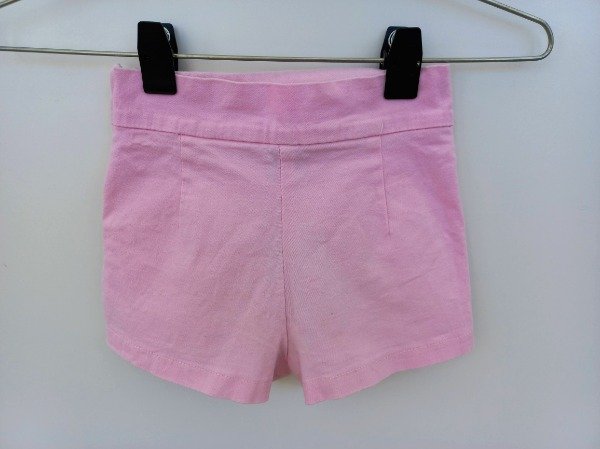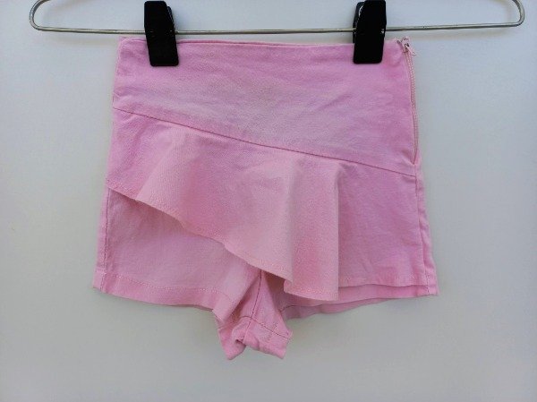 Short de gabardina elastizada en color rosado. Detalle de volado al frente que simula pollera. Tiene cierre en uno de los laterales. Medidas: cintura 24 cm, largo 23 cm. USADO, buen estado