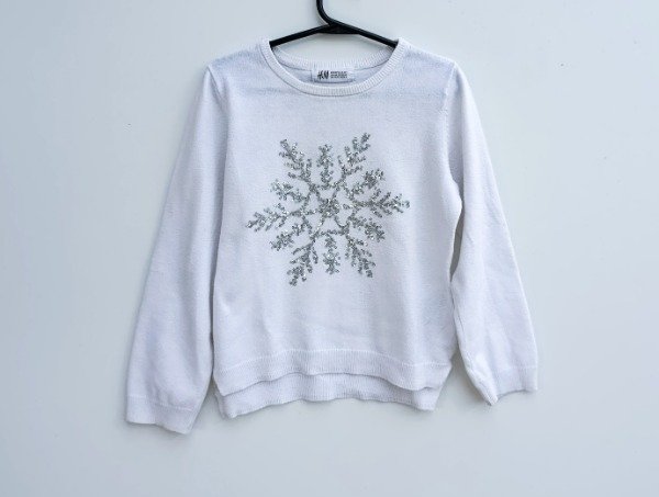Sweater de hilo en color blanco con aplique en lentejuelas al frente. Talle 4-6 años. Medidas: ancho de hombro 28 cm, largo de manga 42 cm, largo total 43 cm. USADO, buen estado
