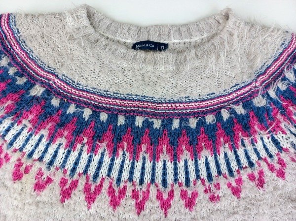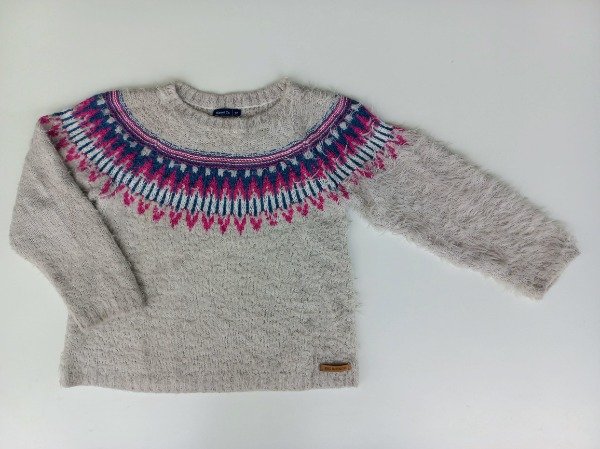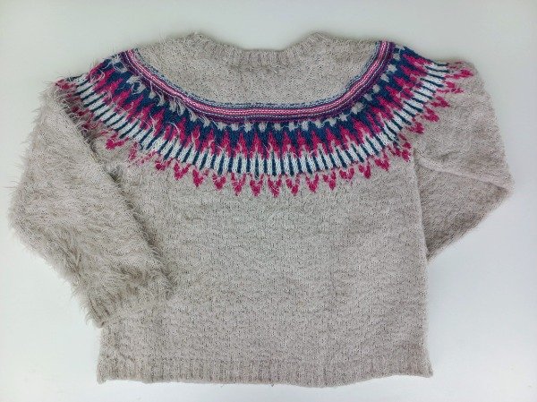 Sweater tejido jacquard color gris. Medidas: ancho de hombro 37 cm, largo de manga 52 cm, largo total 54 cm. USADO