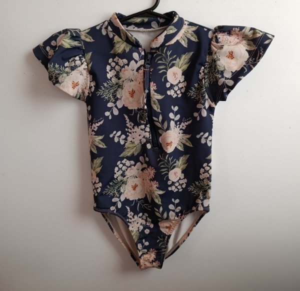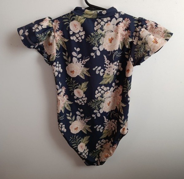 Malla manga corta de lycra estampada con protección UV. Tiene forro interior, cierre al frente y terminación de volados en mangas. Medidas: ancho de hombros 27 cm, largo total 58 cm. USADO, buen estado