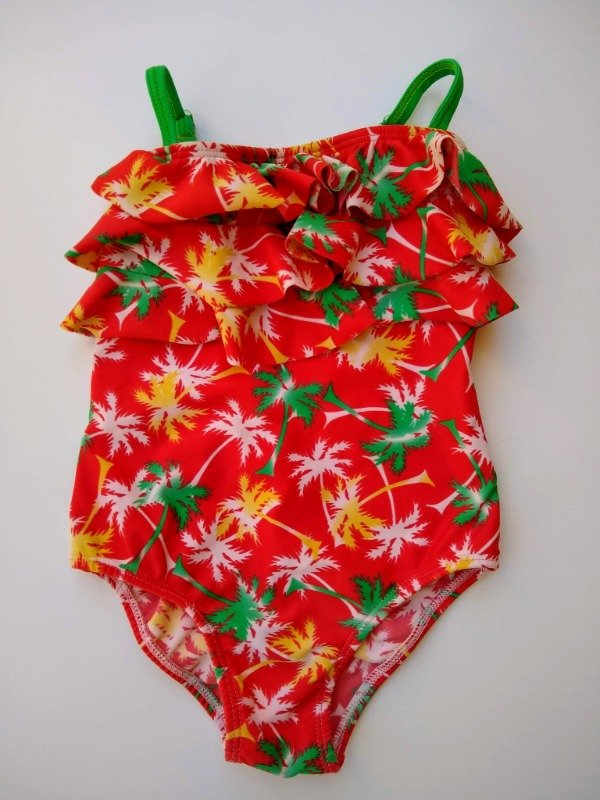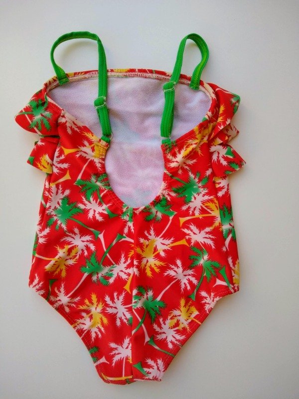 Malla enteriza estampada con volados en la pechera. Breteles regulables. Forrada en la parte delantera. Largo total 42 cm. USADO