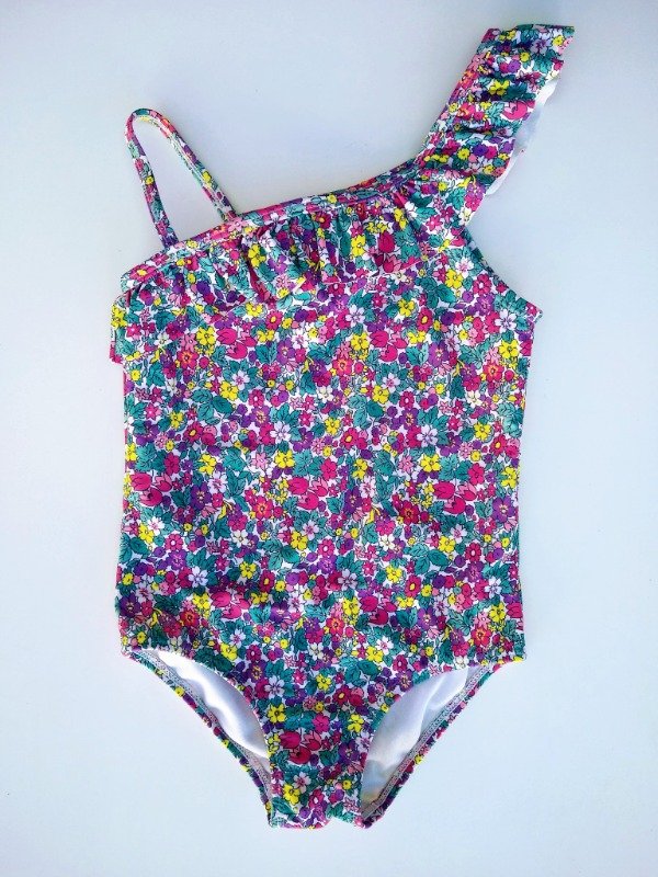 Malla enteriza con volado en el contorno del pecho y un hombro. Largo total 51 cm. USADO
