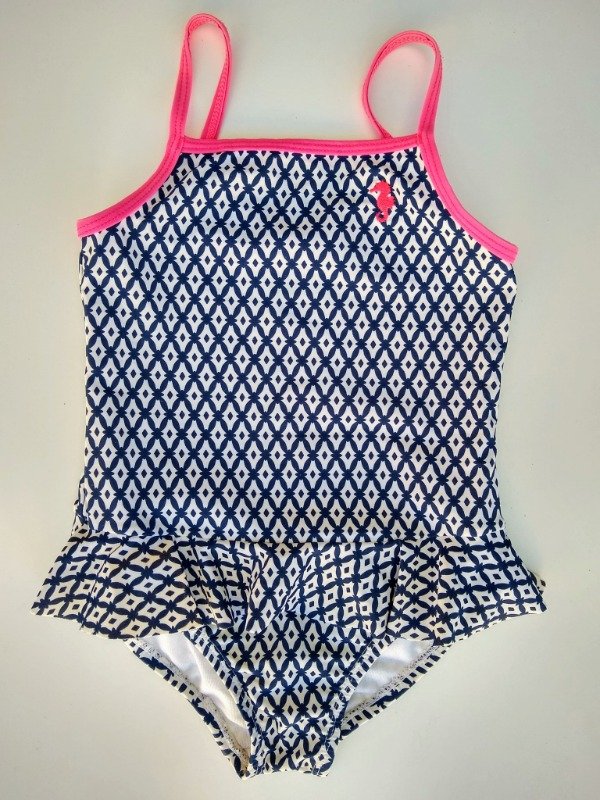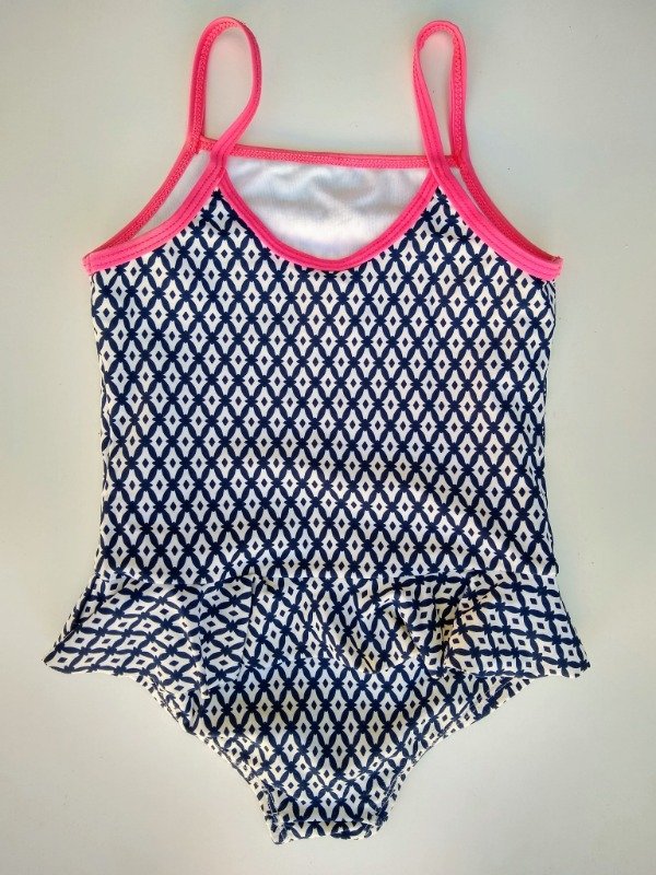 Malla enteriza estampada con volado en la cintura. Largo total 45 cm. USADO, buen estado