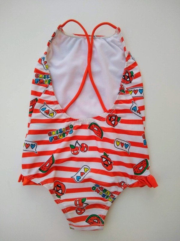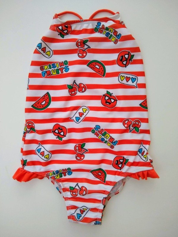 Malla enteriza rayada rojo y blanco. Talle 7-8 años. Largo total 48 cm. USADO