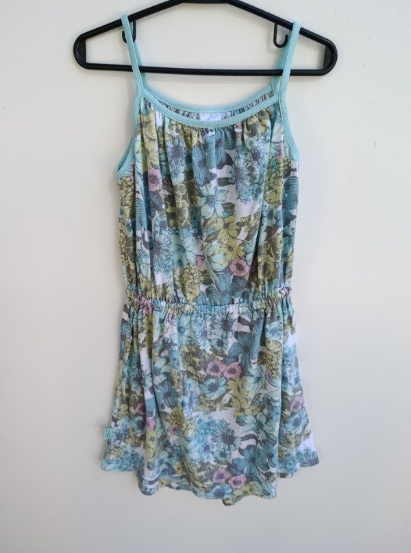 Solero de algodón estampado en tonos verdes. Tiene elástico en la cintura. Medidas: ancho de sisa a sisa 36 cm, largo 63 cm. USADO, buen estado