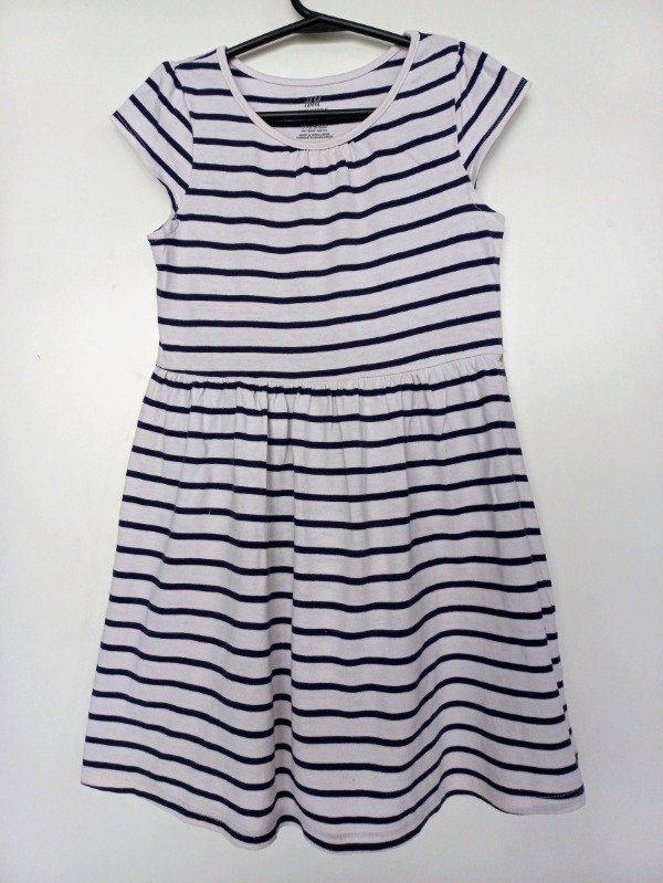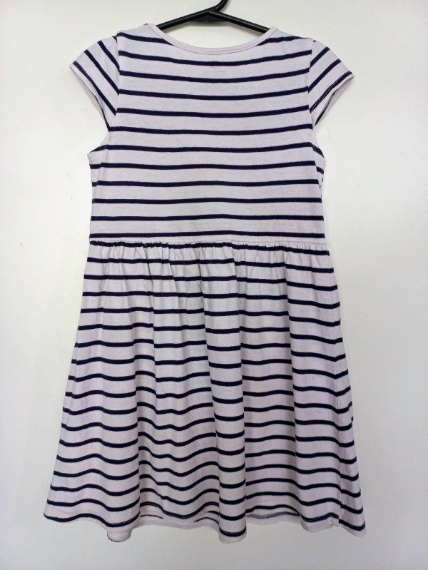 Vestido manga corta de algodón rayado azul y blanco. Talle 4-6 años. Medidas: ancho de hombro 24 cm, largo total 62 cm. USADO, buen estado