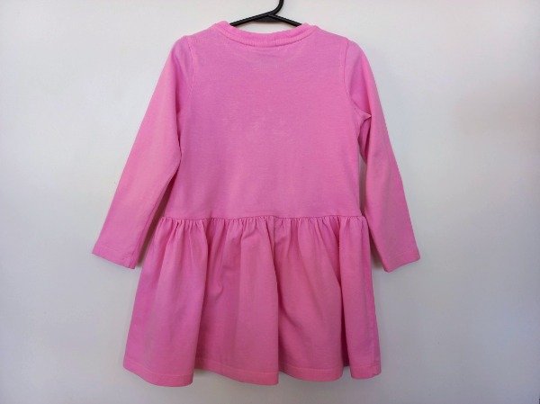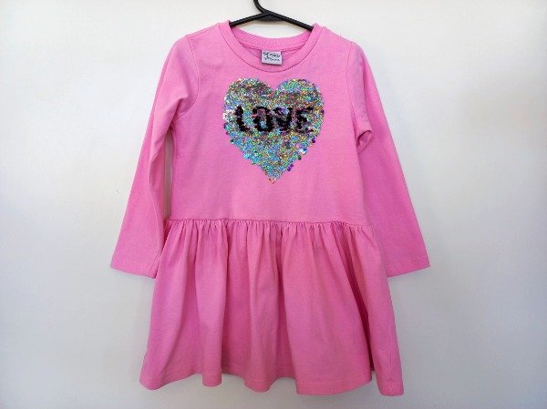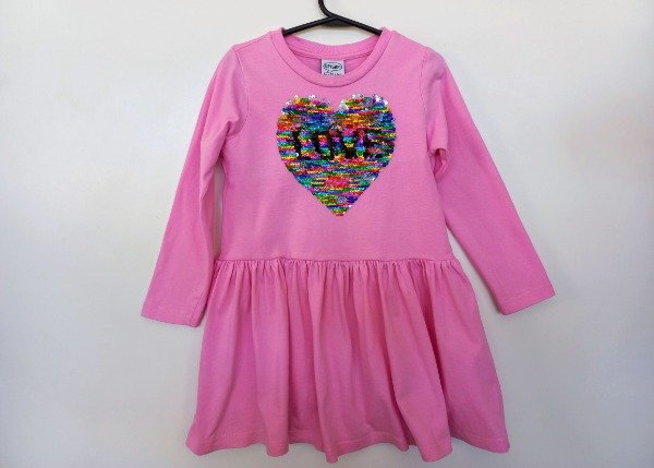 Vestido manga larga de algodón color rosado con aplique en lentejuelas bifaz. Talle 4-5 años. Medidas: ancho de hombro 25 cm, largo de manga 37,5 cm, largo total 57 cm. COMO NUEVO