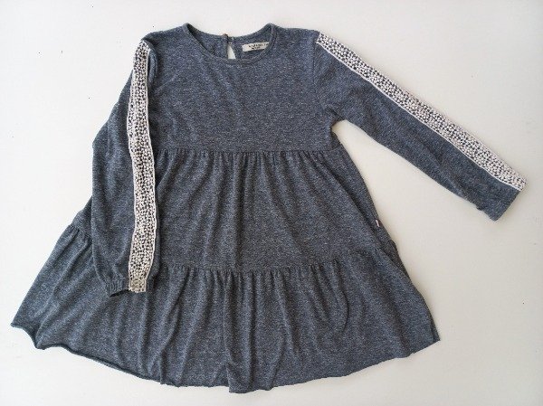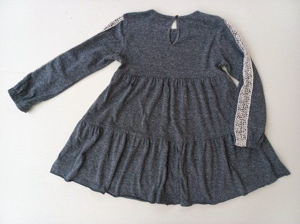 Vestido manga larga de algodón color gris melange. Tiene detalle de puntillas en las mangas. Medidas: ancho de hombro 32 cm, largo de manga 45 cm, largo total 64 cm. COMO NUEVO