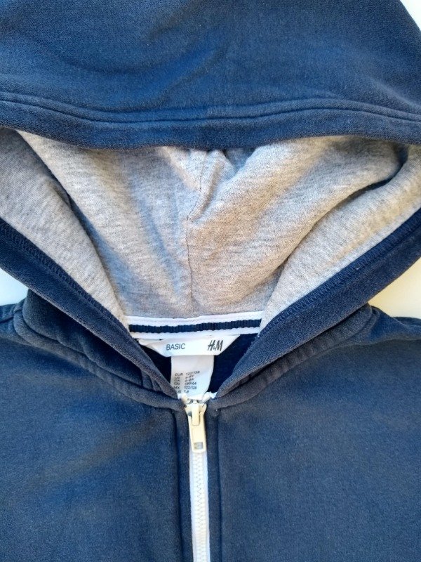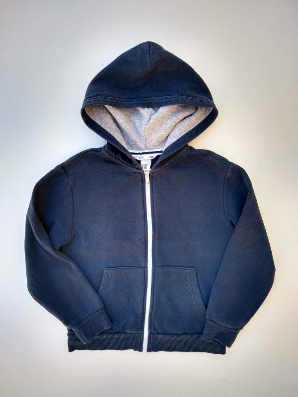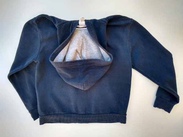 Campera de algodón con friza color azul. Tiene capucha y bolsillos externos. Talle 6-8 años. Medidas: ancho de hombro 37 cm, largo de manga 44 cm, largo total 47,5 cm. USADO