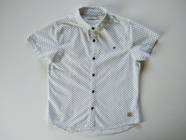 Camisa manga corta blanca con anclas azules y rojas. Medidas: ancho de hombro 34 cm, largo 54 cm. COMO NUEVO