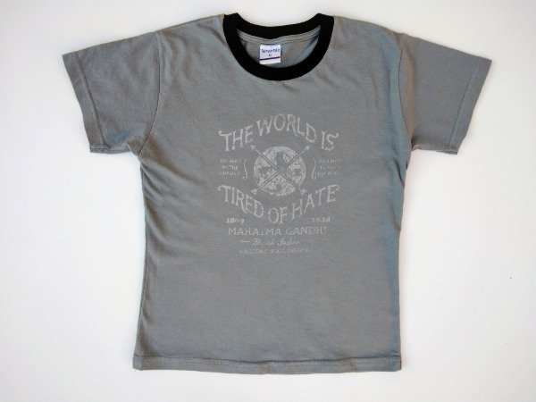 Remera manga corta de algodón color gris con estampa al frente. Medidas: ancho de hombro 38 cm, largo 54,5 cm. USADO, buen estado