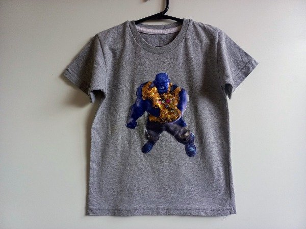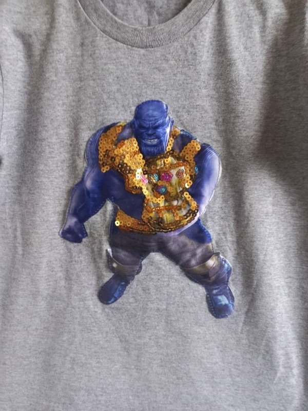 Remera manga corta de algodón color gris melange con estampa con lentejuelas y luces. Medidas: ancho de hombro 28 cm, largo 46 cm. NUEVO SIN ETIQUETA