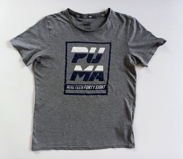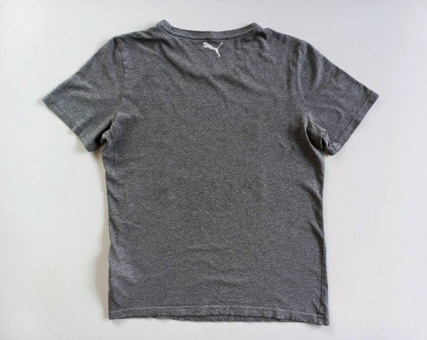 Remera manga corta de algodón color gris melange con estampa al frente. Talle 13-14 años. Medidas: ancho de hombro 39 cm, largo 62 cm. USADO, excelente estado