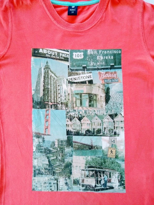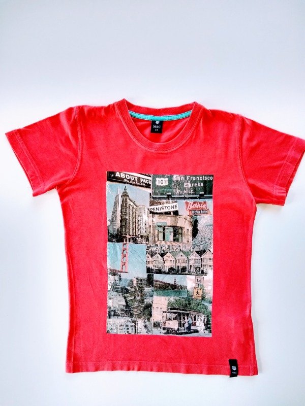 Remera de algodón manga corta con estampa al frente. Medidas: ancho de hombros 32 cm, largo total 54 cm. USADO, buen estado