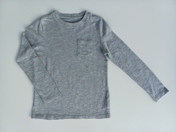 Remera manga larga de algodón color gris melange. Talle S (4-6 años). Medidas: ancho de hombro 29 cm, largo de manga 47,5 cm, largo total 51 cm. USADO, buen estado